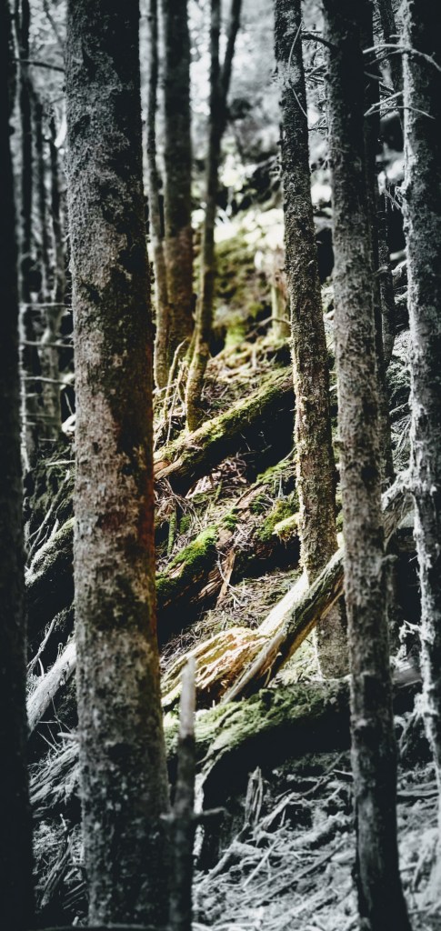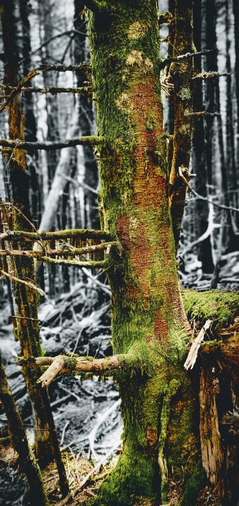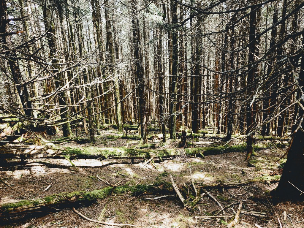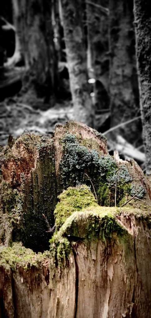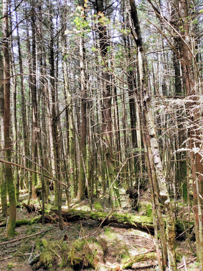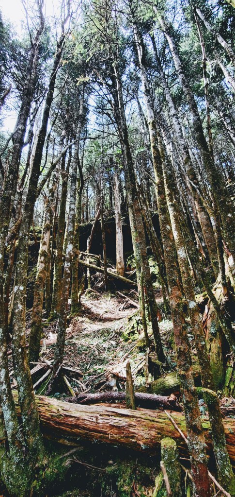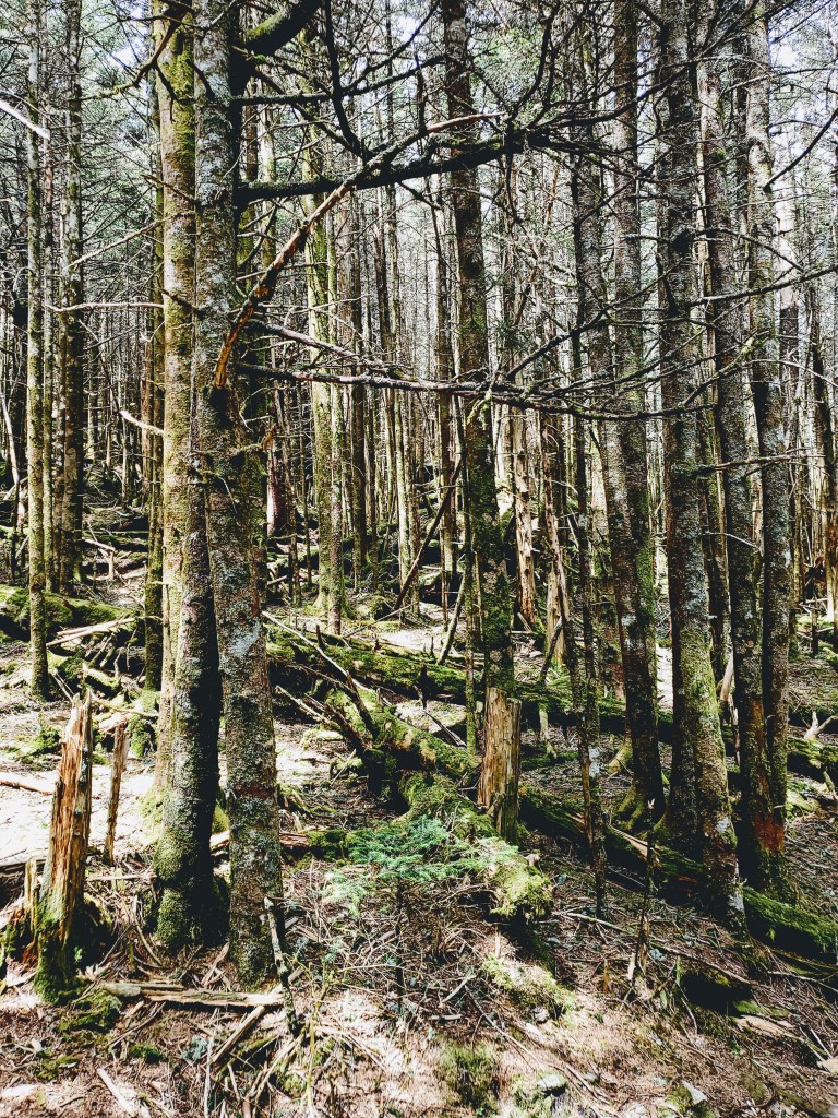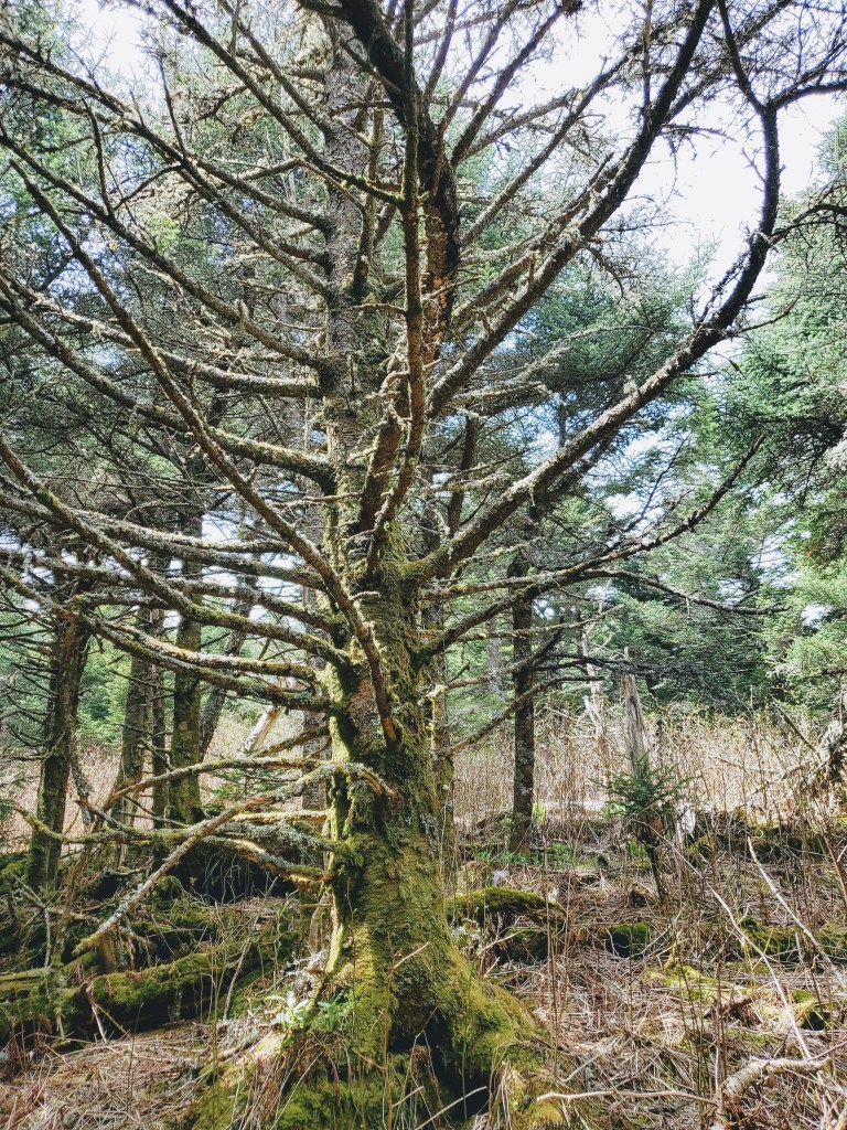 Going into her forest is like stepping into another world full of moss-covered trees and giant stones, thousands of different kinds of mushrooms. As you sit under the fir on the moss cover ground, you hear many different birds singing, from Ravens, Saw-whet Owl, Blue-headed Vireo, and many more. It’s even more magical when the clouds are around as there is a thick layer of fog all around. This is a great place to reflect and be with nature and tell you a forgotten story.